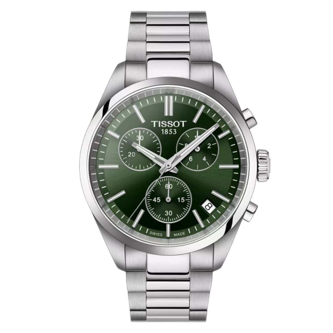 The Tissot PR 100 Chronograph is a versatile timepiece that combines classic design with modern functionality. Featuring a 40mm stainless steel case, a green dial with chronograph functions, and a stainless steel bracelet, this watch is powered by a Swiss quartz movement and is water-resistant up to 100 meters.