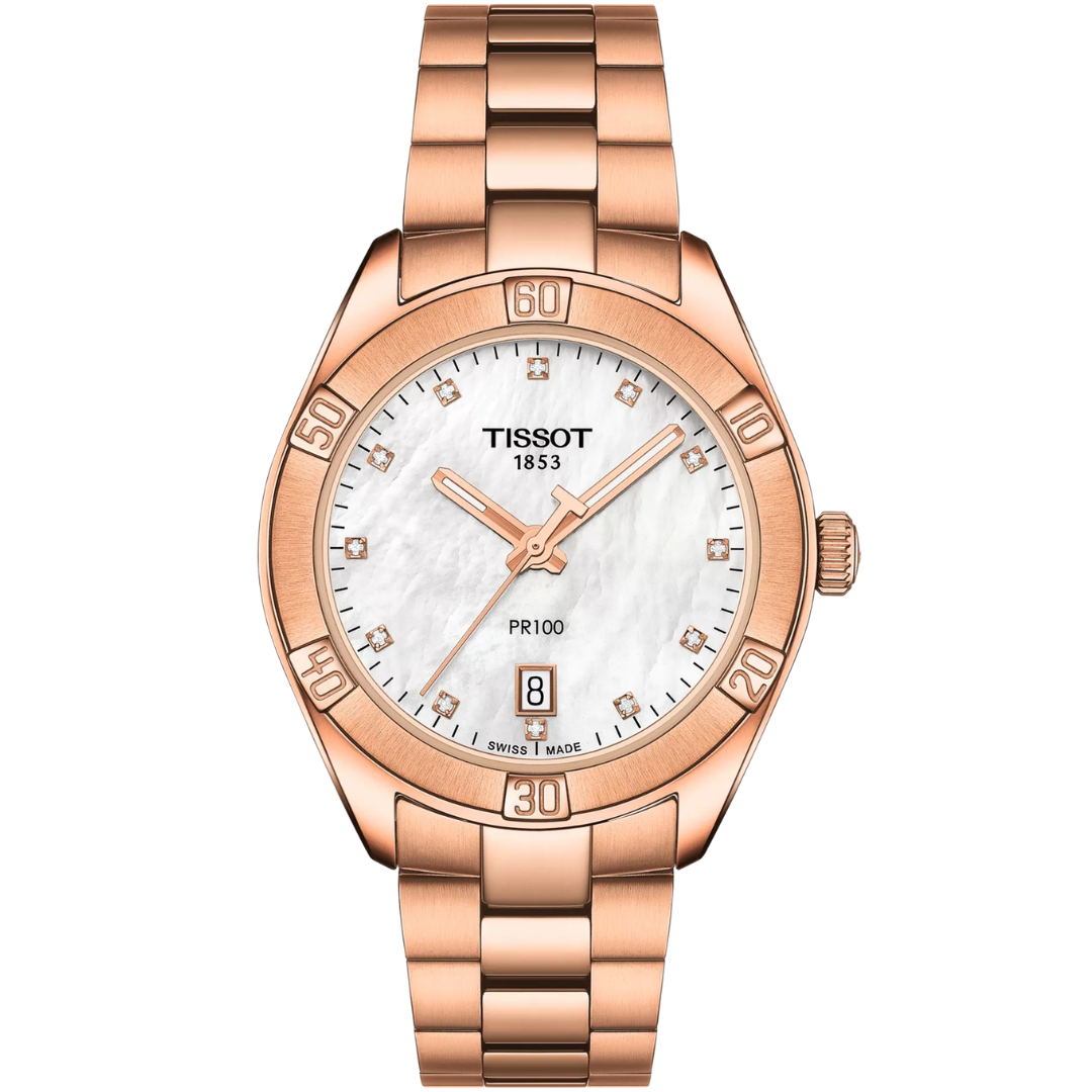 The Tissot T1019103311600 from the PR 100 Lady Sport Chic collection delivers a sophisticated look that fits every occasion. With a two-tone stainless steel bracelet in silver and rose gold tones, plus a natural mother-of-pearl dial, this Swiss-made watch blends feminine charm with everyday durability. It’s designed for women who want style and reliability in one elegant package.