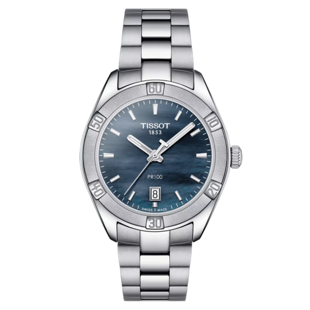 The Tissot PR 100 Sport Chic is a versatile women’s timepiece that combines sporty elegance with Swiss precision. Featuring a 36mm stainless steel case, a black mother-of-pearl dial, and a stainless steel bracelet, this watch is powered by a Swiss quartz movement and is water-resistant up to 100 meters.