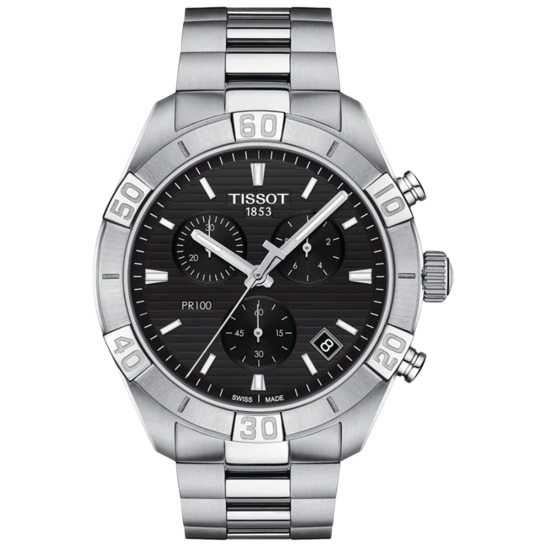 The Tissot PR 100 Sport Gent Chronograph is a versatile timepiece featuring a 44mm stainless steel case, black dial with luminescent indexes, and a scratch-resistant sapphire crystal. This watch combines sporty aesthetics with practical functionality, offering precise chronograph capabilities and a date display.