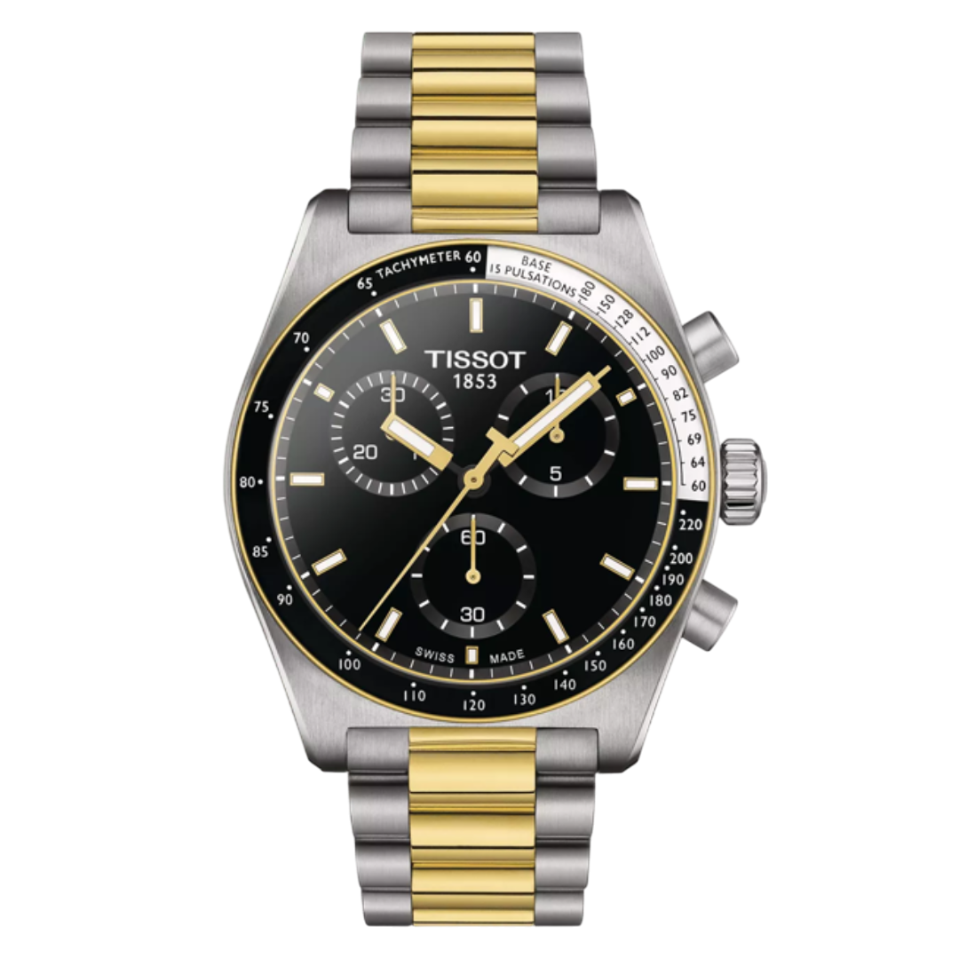 The Tissot PR516 Chronograph Quartz is a modern reinterpretation of a classic 1970 design, featuring a 40mm stainless steel case with yellow gold PVD coating, a black dial with chronograph functions, and a two-tone stainless steel bracelet. Powered by the Swiss Quartz G10.212 Powerdrive movement, it ensures precise timekeeping and includes a tachymeter bezel for speed measurement. The watch is protected by a scratch-resistant sapphire crystal with an antireflective coating and is water-resistant up to 100 meters.