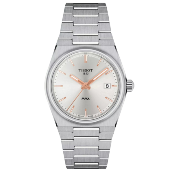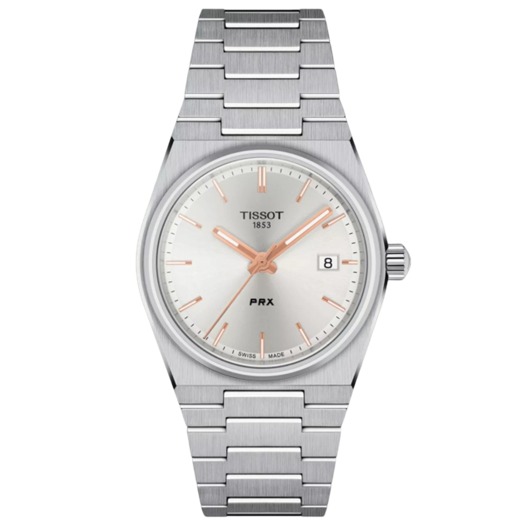 The Tissot PRX 35mm is a Swiss-made quartz watch that combines classic design with modern features. It features a 35mm stainless steel case, a silver sun-brushed dial, and a stainless steel bracelet with quick-release functionality. Powered by a Swiss Quartz movement, the watch offers water resistance up to 100 meters, making it suitable for daily wear.