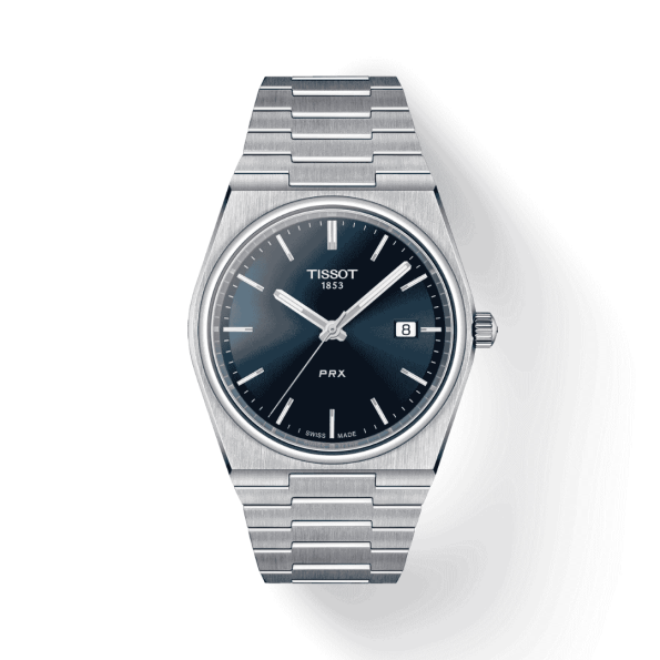 The Tissot PRX 40mm features a 40mm stainless steel case housing a Swiss quartz movement. Its blue dial is complemented by silver-tone hands and index hour markers, all protected by a scratch-resistant sapphire crystal. The watch is water-resistant up to 100 meters and comes with an integrated stainless steel bracelet.
