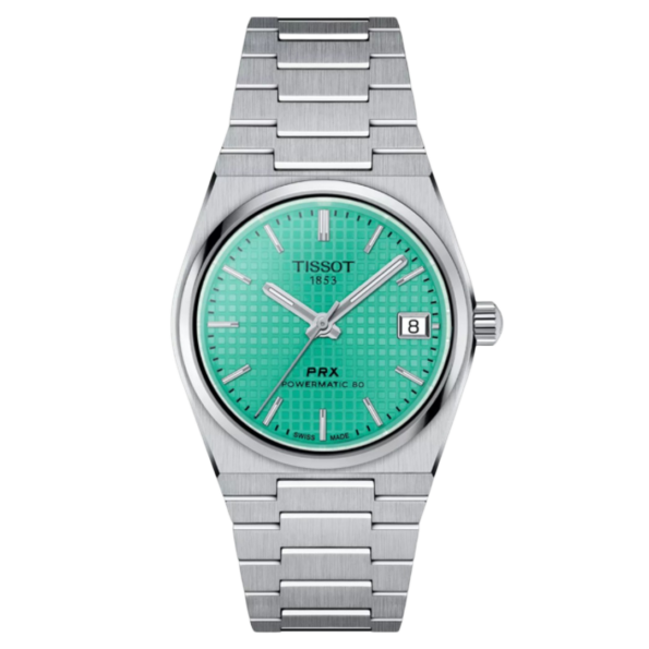 The Tissot PRX Powermatic 80 35mm is a Swiss-made automatic watch that combines classic design with modern technology. It features a 35mm stainless steel case with a gold-PVD coating, a striking mint green waffle-patterned dial, and a stainless steel bracelet. Powered by the Powermatic 80 movement, it offers an impressive 80-hour power reserve. The watch is water-resistant up to 100 meters, making it suitable for daily wear.