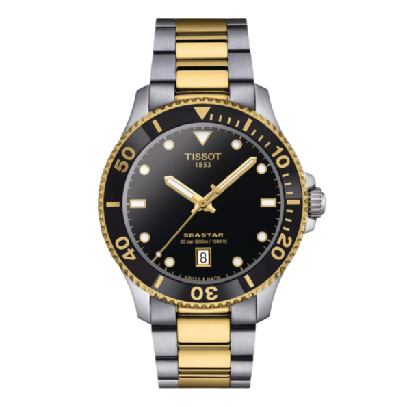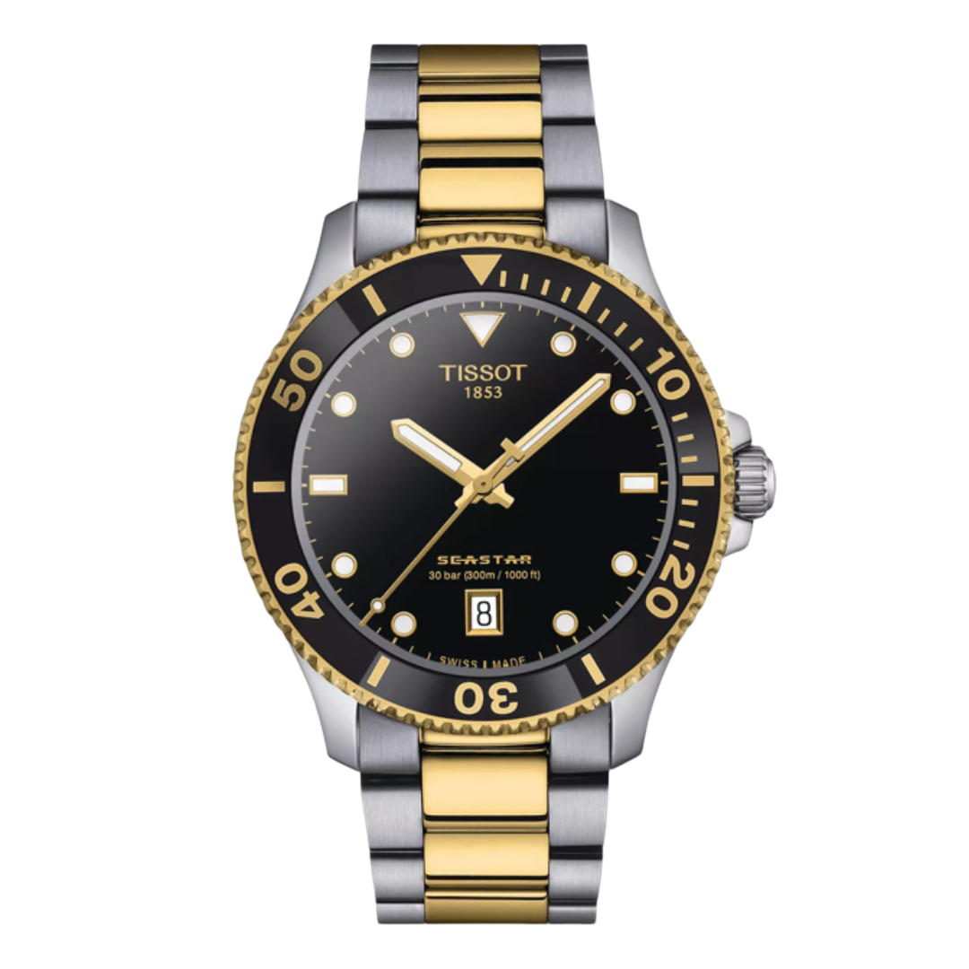 The Tissot Seastar 1000 Quartz 40mm is a versatile timepiece featuring a 40mm stainless steel case with black PVD coating, a black dial with gold-tone indices and hands, and a two-tone stainless steel bracelet. Powered by a Swiss quartz movement, it ensures precise timekeeping and is protected by a scratch-resistant sapphire crystal with double-sided antireflective coating. The watch is water-resistant up to 300 meters, making it suitable for diving and water sports.