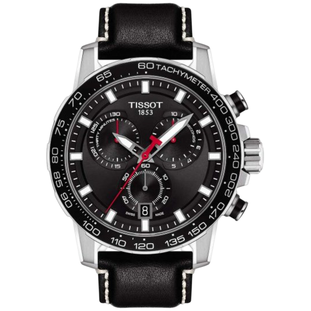 The Tissot Supersport Chrono (Model T125.617.16.051.00) is part of a modern and futuristic collection designed for those seeking a versatile chronograph suitable for both sports and everyday wear. The 45.5mm 316L stainless steel case ensures durability, while the black dial provides a sleek and contemporary look. The dial features indexes filled with SuperLuminova® and asymmetric appliques, adding a powerful 3D effect and ensuring impressive readability in dark conditions. The watch is powered by a Swiss quartz movement, ensuring accurate timekeeping. The scratch-resistant sapphire crystal protects the dial, maintaining clarity over time. Additional features include a chronograph function with 30-minute and 1/10th of a second counters, central 60-second chronograph hand, and a date display. The black leather strap with a standard buckle ensures a secure and comfortable fit. With water resistance up to 100 meters (330 feet), this timepiece is suitable for swimming and snorkeling but not for diving.