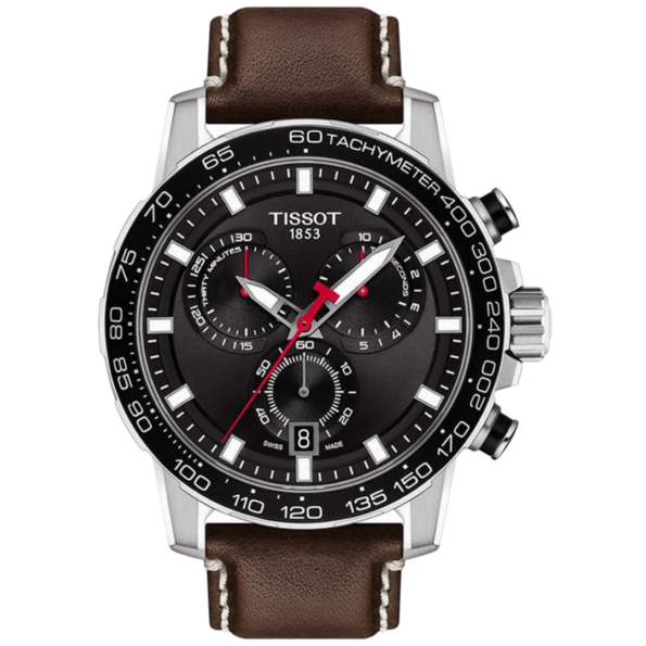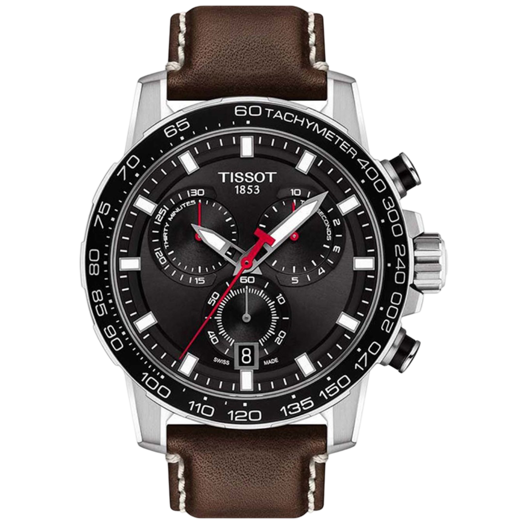 The Tissot Supersport Chrono (Model T125.617.16.051.01) is part of a modern and futuristic collection designed for those seeking a versatile chronograph suitable for both sports and everyday wear. The 45.5mm 316L stainless steel case ensures durability, while the black dial provides a sleek and contemporary look. The dial features indexes filled with SuperLuminova® and asymmetric appliques, adding a powerful 3D effect and ensuring impressive readability in dark conditions. The watch is powered by a Swiss quartz movement, ensuring accurate timekeeping. The scratch-resistant sapphire crystal protects the dial, maintaining clarity over time. Additional features include a chronograph function with 30-minute and 1/10th of a second counters, central 60-second chronograph hand, add and split functions, and a date display. The brown embossed cow leather strap with a standard buckle ensures a secure and comfortable fit. With water resistance up to 100 meters (10 bar), this timepiece is suitable for swimming and snorkeling but not for diving.