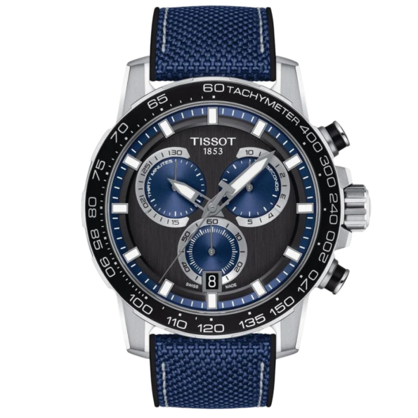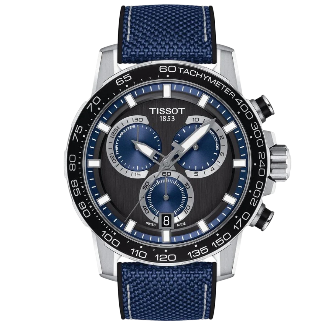 The Tissot Supersport Chrono (Model T125.617.17.051.03) is part of a modern and futuristic collection designed for those seeking a versatile chronograph suitable for both sports and everyday wear. The 45.5mm 316L stainless steel case ensures durability, while the blue dial provides a sleek and contemporary look. The dial features indexes filled with SuperLuminova®, adding a powerful 3D effect and ensuring impressive readability in dark conditions. The watch is powered by a Swiss quartz movement, ensuring accurate timekeeping. The scratch-resistant sapphire crystal protects the dial, maintaining clarity over time. Additional features include a chronograph function with 30-minute and 1/10th of a second counters, central 60-second chronograph hand, add and split functions, and a date display at the 6 o’clock position. The blue textile strap with a standard buckle ensures a secure and comfortable fit. With water resistance up to 100 meters (10 bar), this timepiece is suitable for swimming and snorkeling but not for diving.