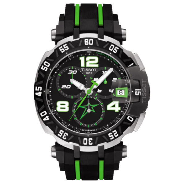 A tribute to the legendary MotoGP rider Nicky Hayden, this limited edition Tissot T-Race watch features a bold design with a 45mm stainless steel case, black dial, and luminescent hands. The watch is equipped with chronograph functionality and a tachymeter bezel, making it a perfect companion for motorsport enthusiasts. The black and green rubber strap adds a sporty touch, ensuring comfort and style.