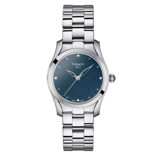 The Tissot T-Wave is an elegant women’s dress watch featuring a 30mm stainless steel case, a captivating blue dial adorned with diamond markers, and a stainless steel bracelet. Its graceful design and quality materials make it a versatile accessory suitable for various occasions.