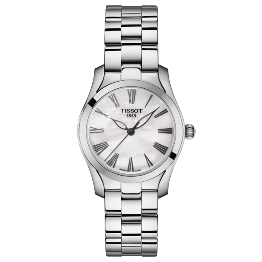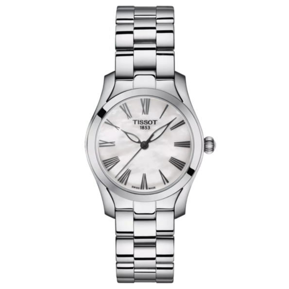 The Tissot T-Wave is an elegant women’s dress watch featuring a 30mm stainless steel case, a white mother-of-pearl dial with Roman numeral markers, and a stainless steel bracelet. Its graceful design and quality materials make it a versatile accessory suitable for various occasions.