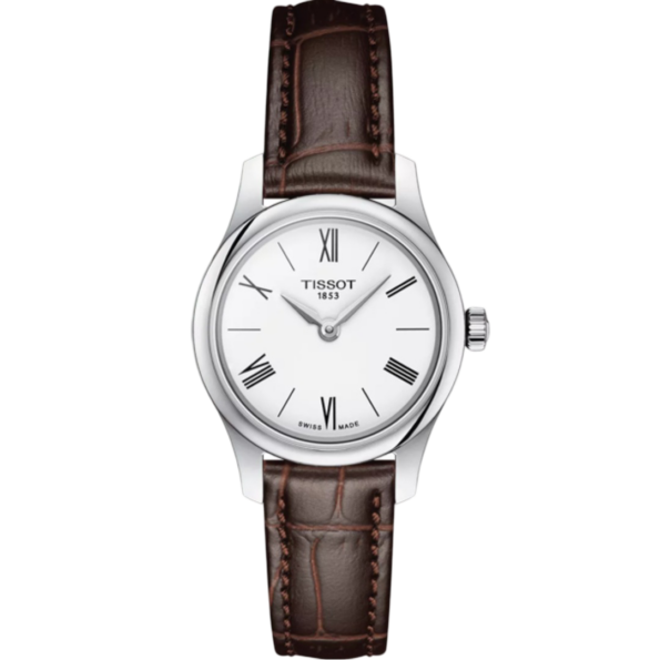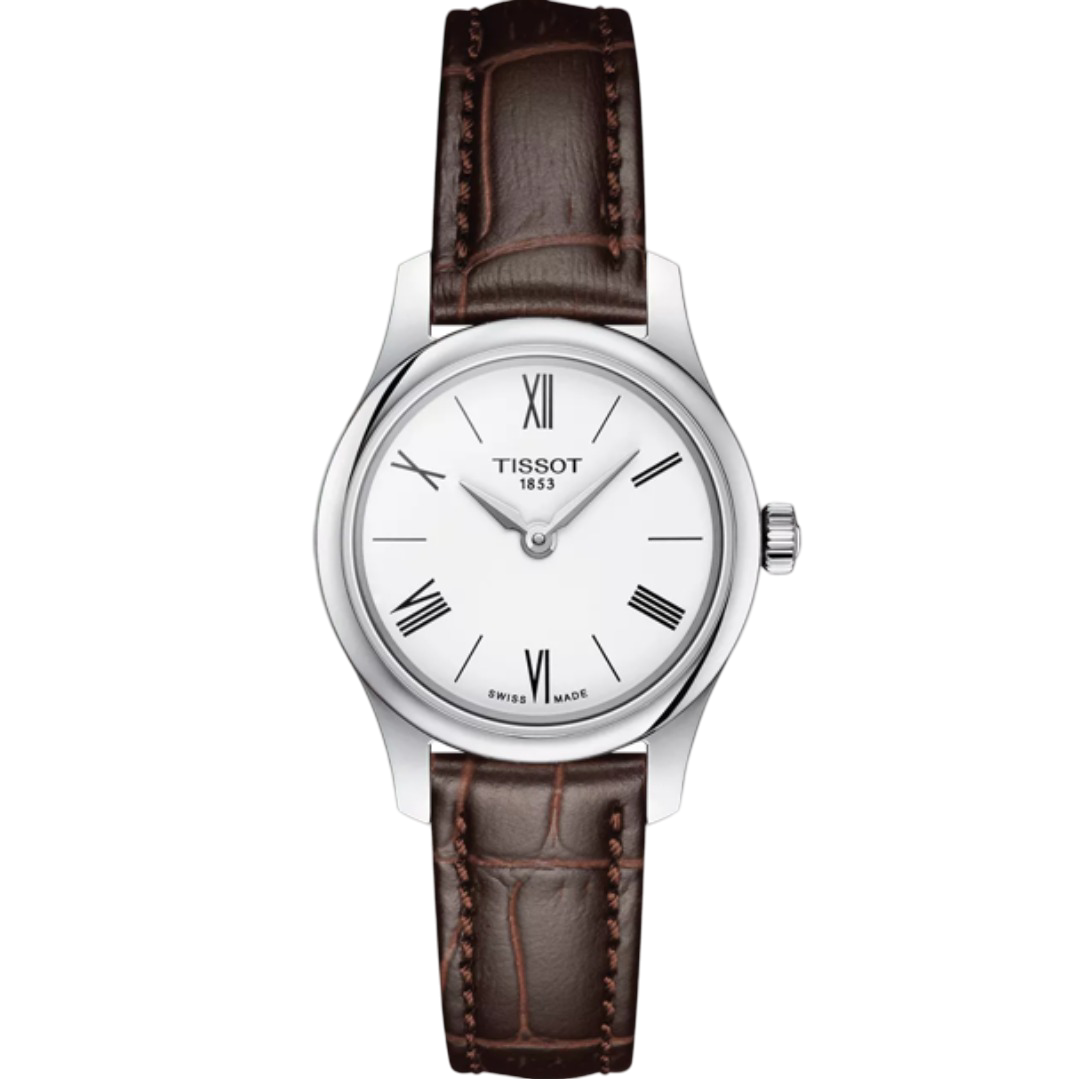 The Tissot Tradition 5.5 Lady is a refined timepiece that blends contemporary design with a touch of nostalgia. Featuring a slim 25mm stainless steel case, white dial with Roman numerals and index markers, and a brown leather strap, this watch embodies elegance and simplicity. Its scratch-resistant sapphire crystal and 30-meter water resistance make it suitable for daily wear.