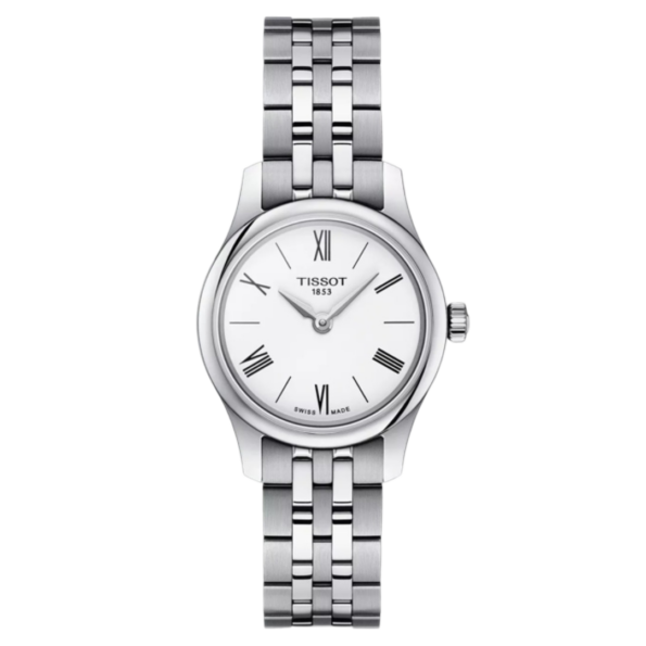 The Tissot Tradition 5.5 Lady is an elegant women’s dress watch featuring a slim 25mm stainless steel case, white dial with Roman numeral and index hour markers, and a scratch-resistant sapphire crystal. Its minimalist design and reliable Swiss quartz movement make it a timeless accessory for any occasion.