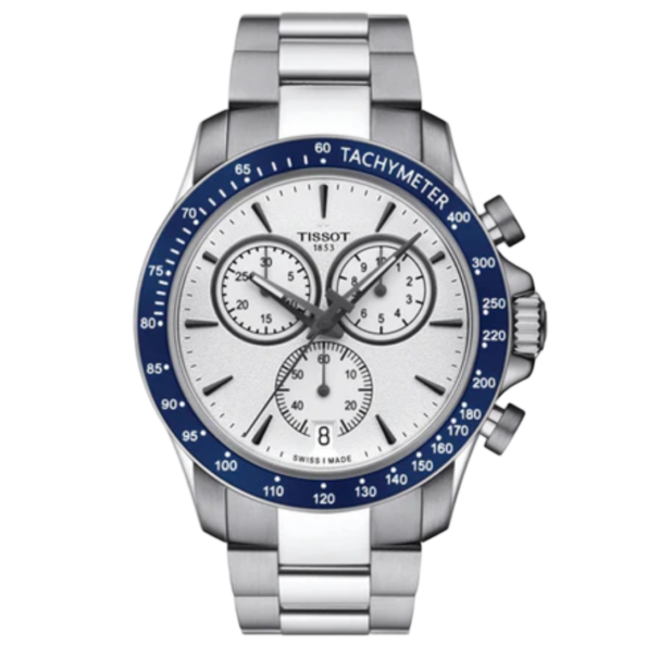 The Tissot V8 Quartz Chronograph is a sporty timepiece featuring a 42.5mm stainless steel case, silver dial with luminescent hands and indexes, and a scratch-resistant sapphire crystal. This watch offers precise chronograph functions and a date display, combining dynamic design with reliable performance.