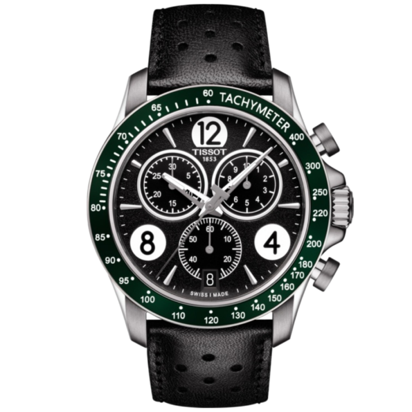 The Tissot V8 Quartz Chronograph is a dynamic timepiece featuring a 42.5mm stainless steel case, black dial with green accents, and a scratch-resistant sapphire crystal. This watch combines sporty design with reliable functionality, offering precise chronograph capabilities and a date display.