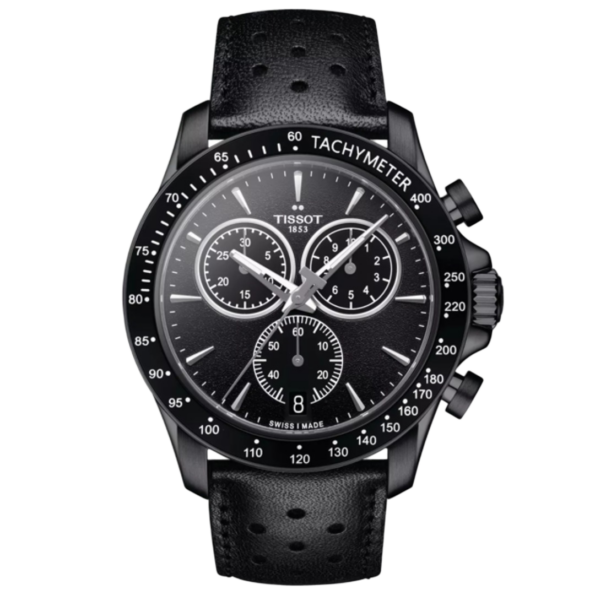 The Tissot V8 Quartz Chronograph (Model T106.417.36.051.00) draws inspiration from motorsports, evident in its dashboard-inspired counters and tachymeter bezel. The 42.5mm black PVD-coated stainless steel case ensures durability and a sleek appearance, while the black dial provides a modern and bold look. Luminescent hands and index hour markers enhance readability in various lighting conditions. The watch is powered by a Swiss quartz movement, ensuring accurate timekeeping. The scratch-resistant sapphire crystal protects the dial, maintaining clarity over time. Additional features include a chronograph function with 30-minute and 1/10th of a second counters, central 60-second chronograph hand, add and split functions, and a date display at the 6 o’clock position. The black perforated leather strap with a standard buckle ensures a secure and comfortable fit. With water resistance up to 100 meters (330 feet), this timepiece is suitable for swimming and snorkeling but not for diving.