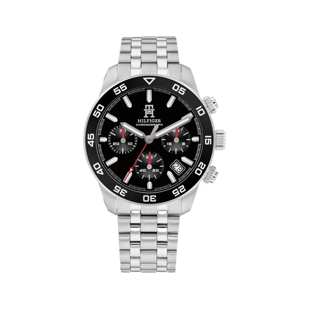 The Tommy Hilfiger Chronograph Watch is a stylish men’s chronograph watch that combines functionality with modern design. Housed in a 41 mm stainless steel case, this timepiece features a sleek black dial with silver-tone hands and hour markers, complemented by red accents for a sporty touch. The chronograph function includes three subdials for measuring elapsed time, along with a date display at the 4 o’clock position. Powered by a reliable Seiko VR32 quartz movement, it ensures precise timekeeping. The watch is secured with a stainless steel bracelet and offers water resistance up to 5 ATM, making it suitable for everyday wear and light exposure to water.