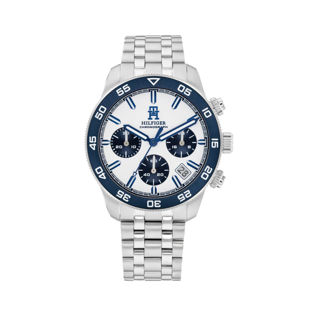 The Tommy Hilfiger Chronograph Watch is a stylish men’s chronograph watch that combines functionality with modern design. Housed in a 41 mm stainless steel case, this timepiece features a white dial accented with blue details, complemented by black subdials for the chronograph functions. The chronograph includes three subdials for measuring elapsed time, along with a date display at the 4 o’clock position. Powered by a reliable quartz movement, it ensures precise timekeeping. The watch is secured with a stainless steel bracelet and offers water resistance up to 5 ATM, making it suitable for everyday wear and light exposure to water. This watch reflects Tommy Hilfiger’s commitment to style, quality, and contemporary design.