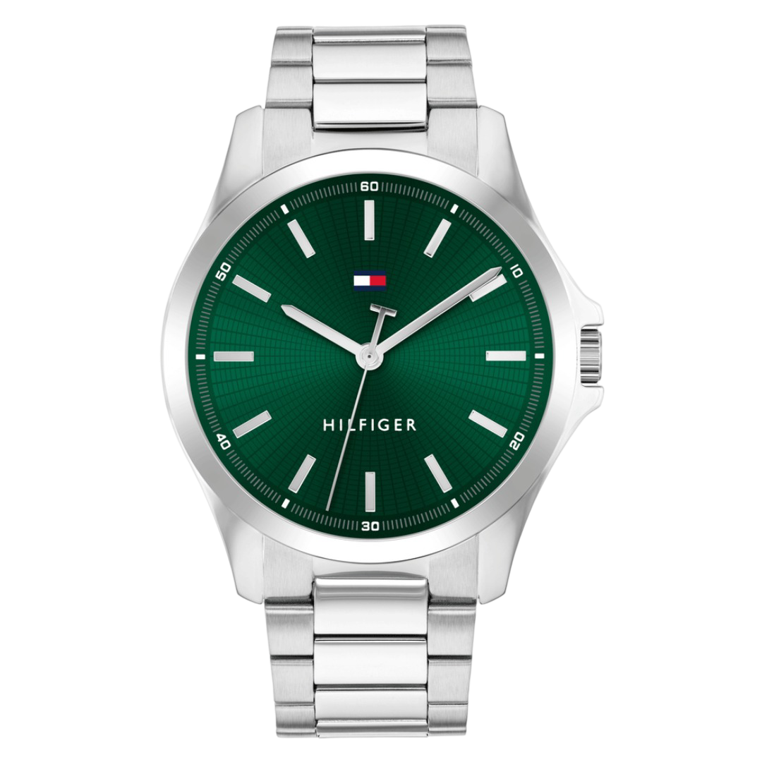 The Tommy Hilfiger Men’s ‘Bruce’ Watch – Model 1710672 features a 43mm stainless steel case paired with a matching stainless steel bracelet, providing both durability and elegance. The green dial includes silver-tone hands and index hour markers, ensuring clear readability. The watch operates on a reliable quartz movement, ensuring precise timekeeping. A mineral crystal protects the dial from scratches, maintaining its clarity over time. With a water resistance of up to 3 ATM (30 meters), this watch is suitable for everyday wear, including exposure to splashes and rain. The combination of its sophisticated design and functional features makes the ‘Bruce’ watch a versatile accessory for any man’s collection.