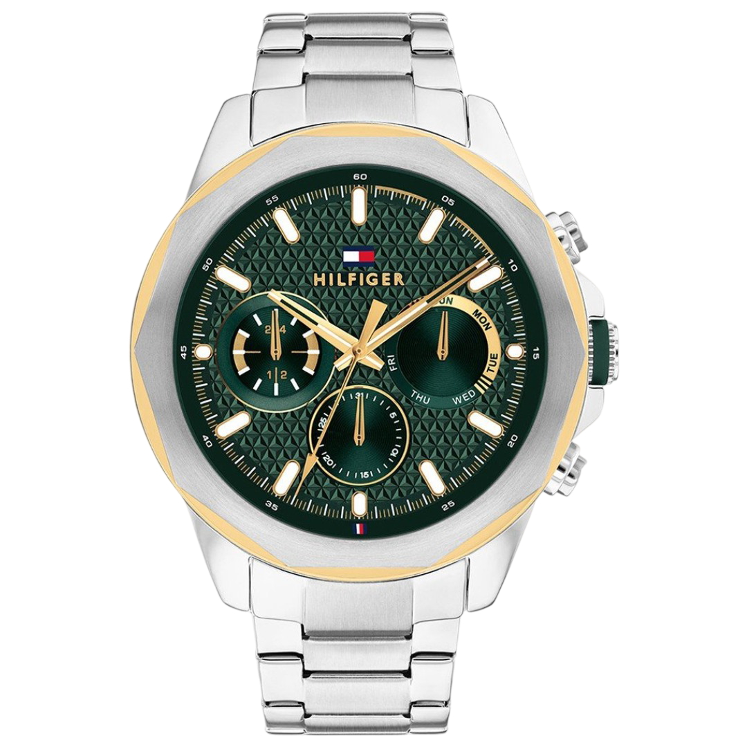 The Tommy Hilfiger Men’s ‘Lars’ Watch – Model 1710651 features a 46mm stainless steel case paired with a matching stainless steel bracelet, providing both durability and a sleek appearance. The striking green dial includes day and date sub-dials, enhancing its practicality for daily use. Silver-tone hands and hour markers ensure clear readability. The watch operates on a reliable quartz movement, ensuring accurate timekeeping. A mineral crystal protects the dial from scratches, maintaining its clarity over time. With a water resistance of up to 5 ATM (50 meters), this watch is suitable for everyday wear, including activities like showering. The combination of its classic design and functional features makes the ‘Lars’ watch a versatile accessory for any man’s collection.