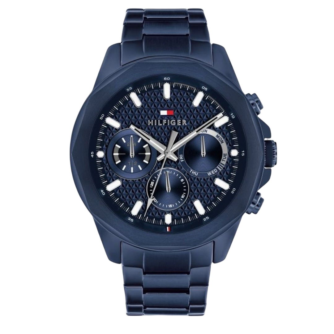 The Tommy Hilfiger Men’s ‘Lars’ Watch – Model 1710652 showcases a 46mm blue PVD-coated stainless steel case, offering a bold and stylish appearance. The textured blue dial includes three sub-dials displaying day, date, and 24-hour time, enhancing its functionality. Silver-tone hands and index hour markers, along with luminescent accents, ensure clear readability. The watch operates on a reliable quartz movement, ensuring precise timekeeping. A mineral crystal protects the dial from scratches, maintaining its clarity over time. The blue PVD-coated stainless steel bracelet secures with a deployment clasp, providing both comfort and security. With a water resistance of up to 5 ATM (50 meters), this watch is suitable for everyday wear, including brief water exposures like handwashing or rain. The combination of its modern design and functional features makes the ‘Lars’ watch a versatile accessory for any man’s collection.