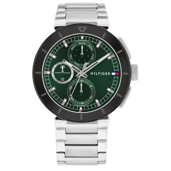 The Tommy Hilfiger Men’s ‘Lorenzo’ Watch – Model 1792117 showcases a 44mm stainless steel case and bracelet, offering a sleek and durable design. The green dial includes three sub-dials displaying day, date, and 24-hour time, providing added functionality. Silver-tone hands and hour markers, along with luminescent accents, ensure clear readability. The watch is powered by a quartz movement and protected by a mineral crystal. With a water resistance of up to 3 ATM (30 meters), it is suitable for everyday wear, including exposure to splashes and rain.