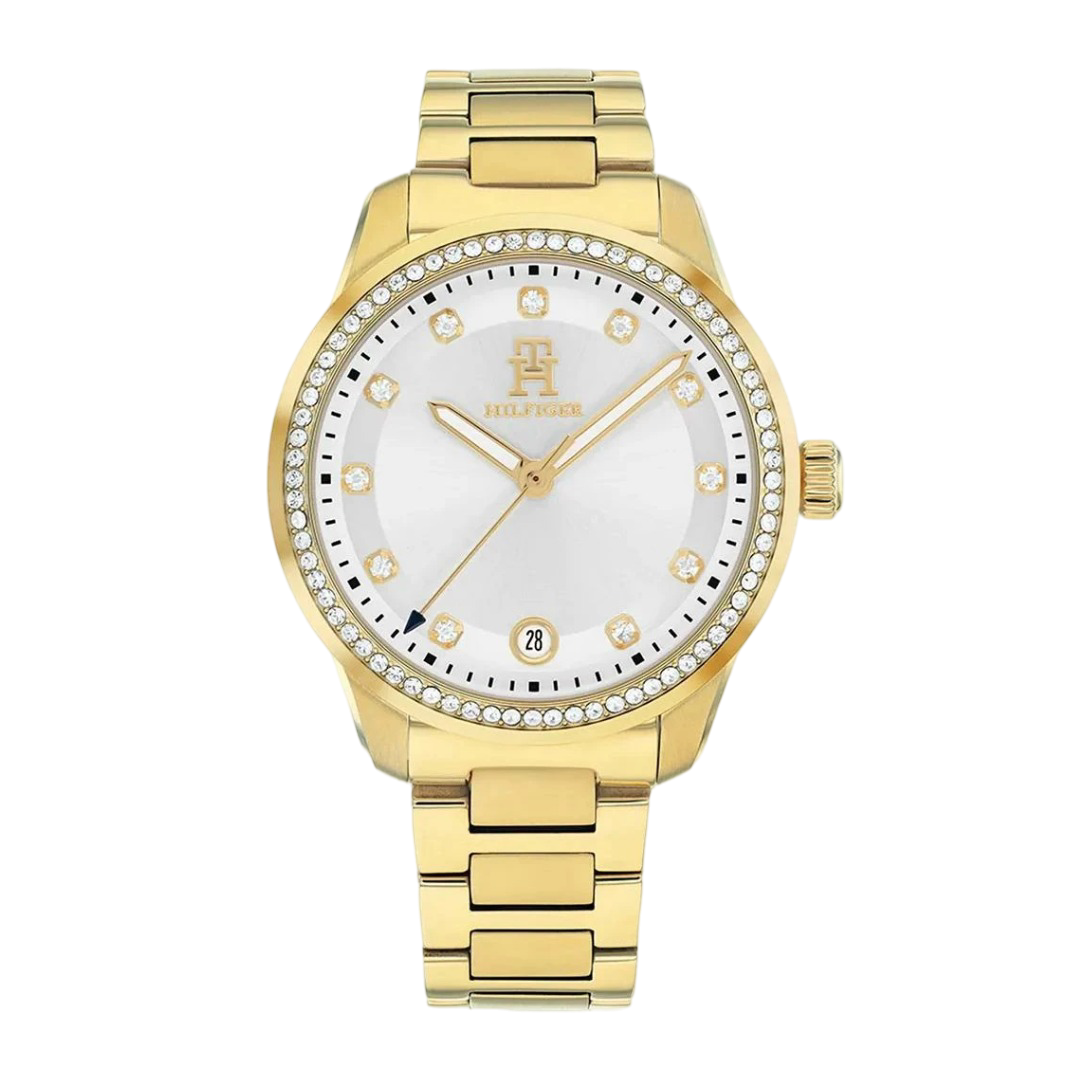 The Tommy Hilfiger Women’s ‘TH85 Crystals’ Gold-Plated Watch – Model 1782758 showcases a refined 36mm gold-plated stainless steel case paired with a matching bracelet, offering a luxurious and timeless appearance. The white sunray dial is enhanced with crystal-embellished hour markers, adding a touch of sparkle to the design. The watch features a date display at the 6 o’clock position for added convenience. It operates on a reliable quartz movement, ensuring precise timekeeping, and is protected by a durable mineral crystal. With a water resistance of up to 5 ATM (50 meters), this watch is suitable for everyday wear, including exposure to splashes and brief immersion in water. The combination of its elegant design and functional features makes the ‘TH85 Crystals’ watch a versatile accessory for any woman’s collection.