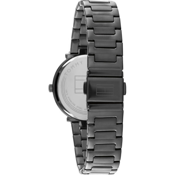 The Tommy Hilfiger Women’s Zoey Watch – Model 1782409 embodies modern elegance with its monochromatic black design. The 34mm black ion-plated stainless steel case houses a black dial adorned with subtle index markers and the iconic Tommy Hilfiger logo, creating a minimalist yet striking appearance. The black stainless steel bracelet complements the case, providing a cohesive and stylish look secured with a folding clasp for comfort and ease. Powered by a reliable quartz movement, this watch ensures precise timekeeping. The mineral crystal protects the dial from scratches, while the 3 ATM water resistance offers protection against minor splashes. Elevate your accessory collection with this contemporary timepiece that seamlessly blends style and functionality.