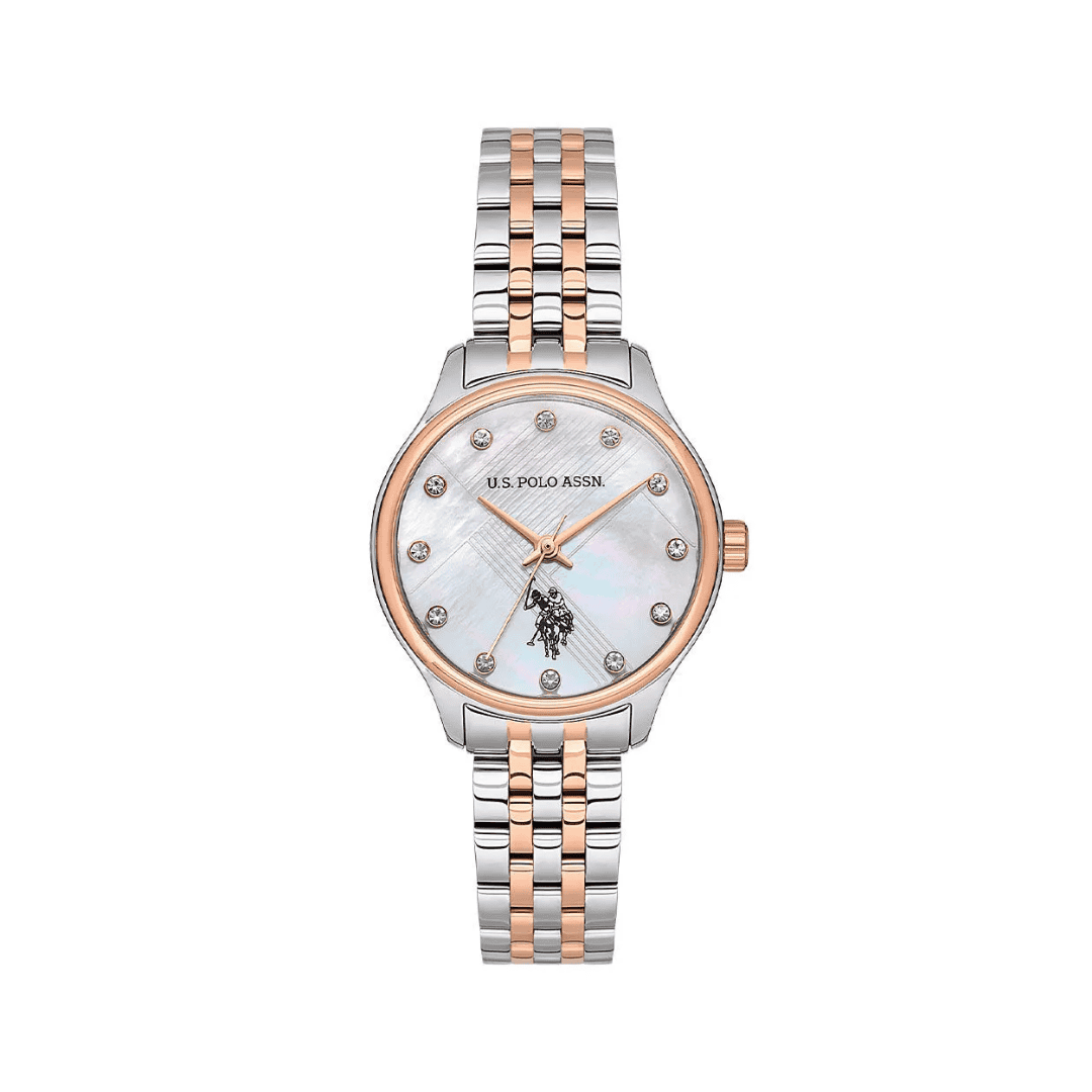 The USPA2071-04 combines elegant styling with everyday functionality. Its 30 mm round stainless steel case in a metallic gray finish houses a luminous mother-of-pearl dial. The bracelet is two-tone—rose gold and metallic gray—bringing a refined contrast to the piece. It features quartz movement for accurate timekeeping, and is protected by a mineral crystal. With water resistance up to 5 ATM, it can handle splashes and brief immersion in water, making it suitable for daily wear. The design omits chronograph and date complications for a clean, classic appearance.