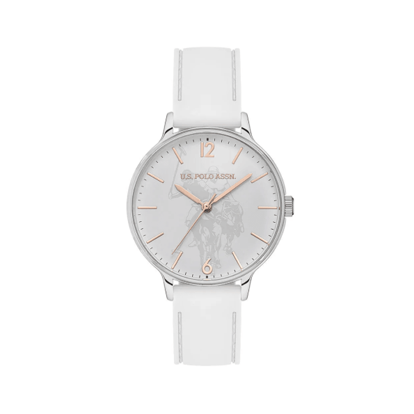 The USPA2075-01 is designed as a sporty and stylish women’s timepiece. It features a 38 mm round metallic gray steel case with 9 mm thickness, paired with a white silicone strap that offers comfort and athletic style. The dial is gray analog, and the watch is powered by a quartz movement. It has a mineral crystal glass and is rated 3 ATM for water resistance, making it suitable for everyday wear and light water exposure. The design omits extra complications like chronograph or calendar, keeping a clean, sporty look.
