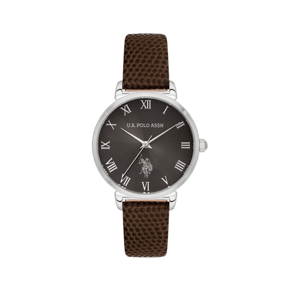 The USPA2077-02 is designed as a classic women’s timepiece. Its 32 mm round metallic gray stainless steel case houses a brown analog dial, offering a warm contrast. The watch is powered by quartz movement and protected by mineral crystal glass. The brown leather strap ensures comfort and durability, making it suitable for daily wear. With a 5 ATM water resistance, it can withstand light splashes but is not suitable for swimming or bathing. The design includes no chronograph or date display, maintaining a clean and timeless aesthetic.