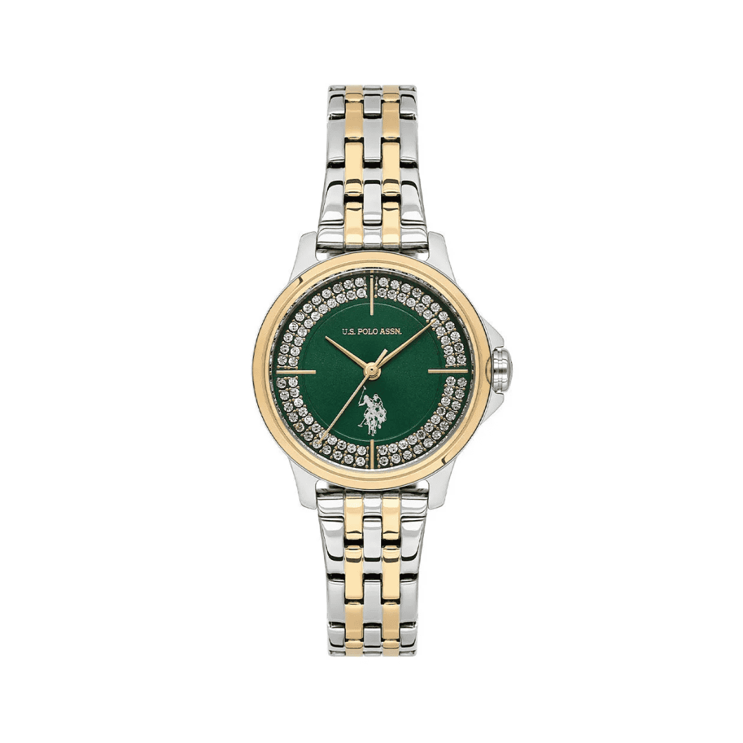 The USPA2081-04 is a stylish women’s timepiece that combines elegance with everyday functionality. Its 30 mm round metallic gray stainless steel case houses a green analog dial, offering a vibrant contrast. The watch is powered by quartz movement and protected by mineral crystal glass. The two-tone steel bracelet ensures comfort and durability, making it suitable for daily wear. With a 3 ATM water resistance, it can withstand light splashes but is not suitable for swimming or bathing. The design includes no chronograph or date display, maintaining a clean and timeless aesthetic.