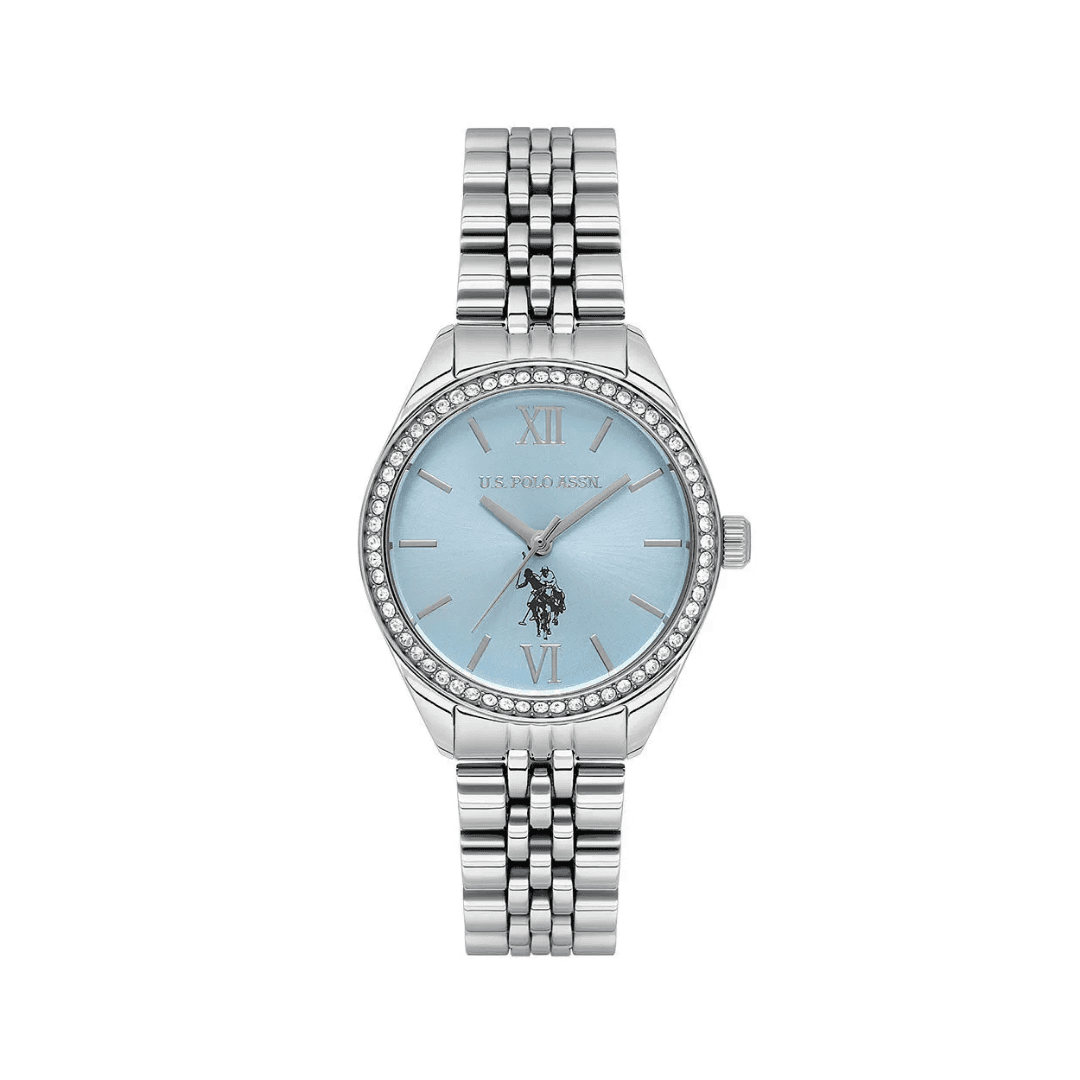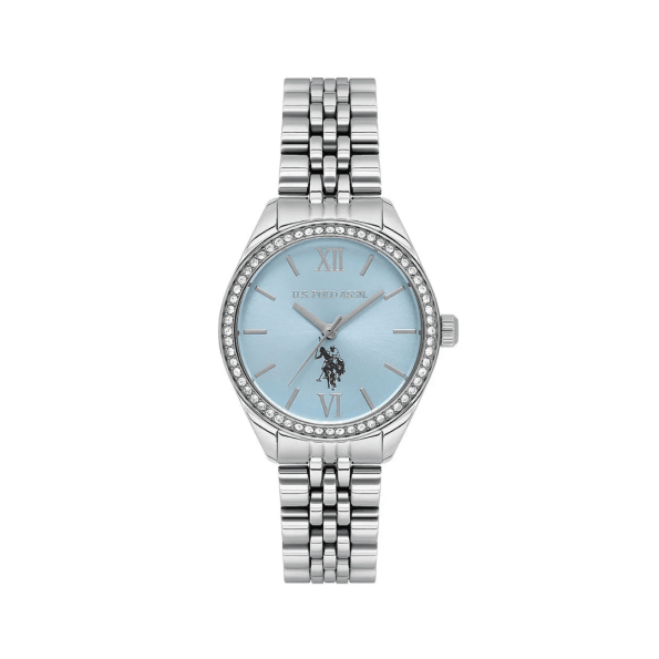 The USPA2085-03 is a stylish women’s timepiece that combines elegance with everyday functionality. Its 30 mm round silver-tone stainless steel case houses a sky-blue analog dial, offering a vibrant contrast. The watch is powered by quartz movement and protected by mineral crystal glass. The silver-tone bracelet strap ensures comfort and durability, making it suitable for daily wear. With a 3 ATM water resistance, it can withstand light splashes but is not suitable for swimming or bathing. The design includes no chronograph or date display, maintaining a clean and timeless aesthetic.