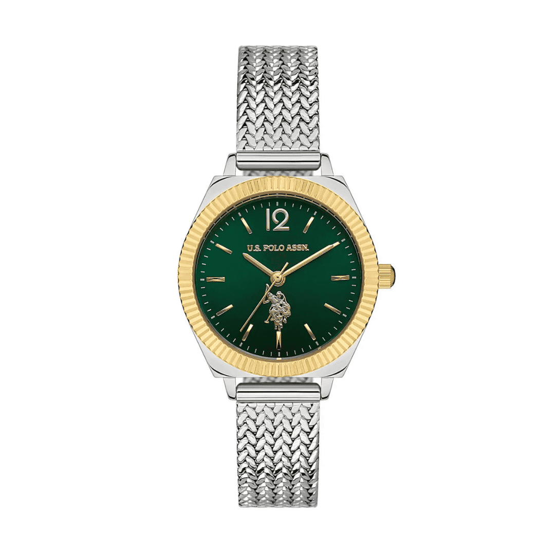 The USPA2062‑06 is a stylish women’s wristwatch that combines elegance with everyday functionality. It features a 28mm round metallic gray stainless steel case with a green dial. The watch is powered by a reliable quartz movement and is protected by a mineral crystal. The metallic gray mesh bracelet adds a touch of sophistication, making it suitable for both casual and formal occasions. With a water resistance of 5 ATM, it offers protection against splashes and brief immersion in water.