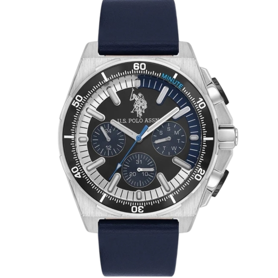 The US Polo Assn. USPA1092-02 Men’s Wristwatch combines classic design with contemporary flair. Its black dial and navy blue leather strap offer a cohesive and stylish look, while the metallic gray stainless steel case adds durability and elegance. Powered by a reliable quartz movement and protected by a mineral glass, this watch is both practical and fashionable. With a 44mm case diameter and 5 ATM water resistance, it’s suitable for everyday wear and special occasions alike.